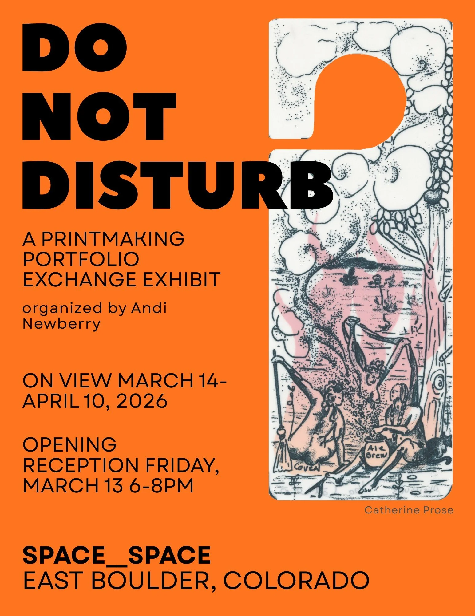 "Do Not Disturb" is a print exchange organized by Andi Newberry, with 17 artist participants across the United States. This project asked artists to consider questions, feelings, and tensions around privacy, home, security, peace, seclusion, community, vigilance, and support. With prints in the shape of doorknob signs, this portfolio and exhibit plays with signifiers of entry and printed matter as barrier. Space__Space is an independent experimental art space in Boulder run by Rory Fitzgerald Bledsoe.
