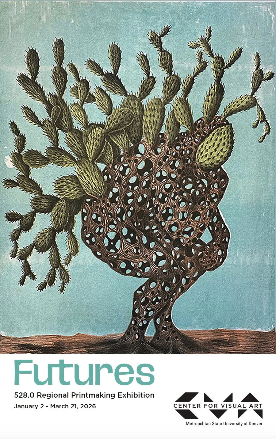 The Futures: 528.0 Print Exhibition gathers voices from across 528.0 miles around Denver to reflect on the evolving language of printmaking, showcasing the vibrant range of traditional and experimental techniques shaping contemporary printmaking today. This juried exhibition invited printmakers to delve into the multifaceted concept of the future. The prints submitted for Futures reflect diverse views on what lies ahead, ranging from hopeful visions to cautionary tales, and celebrate the expansive array of contemporary printmaking techniques found within this western region.