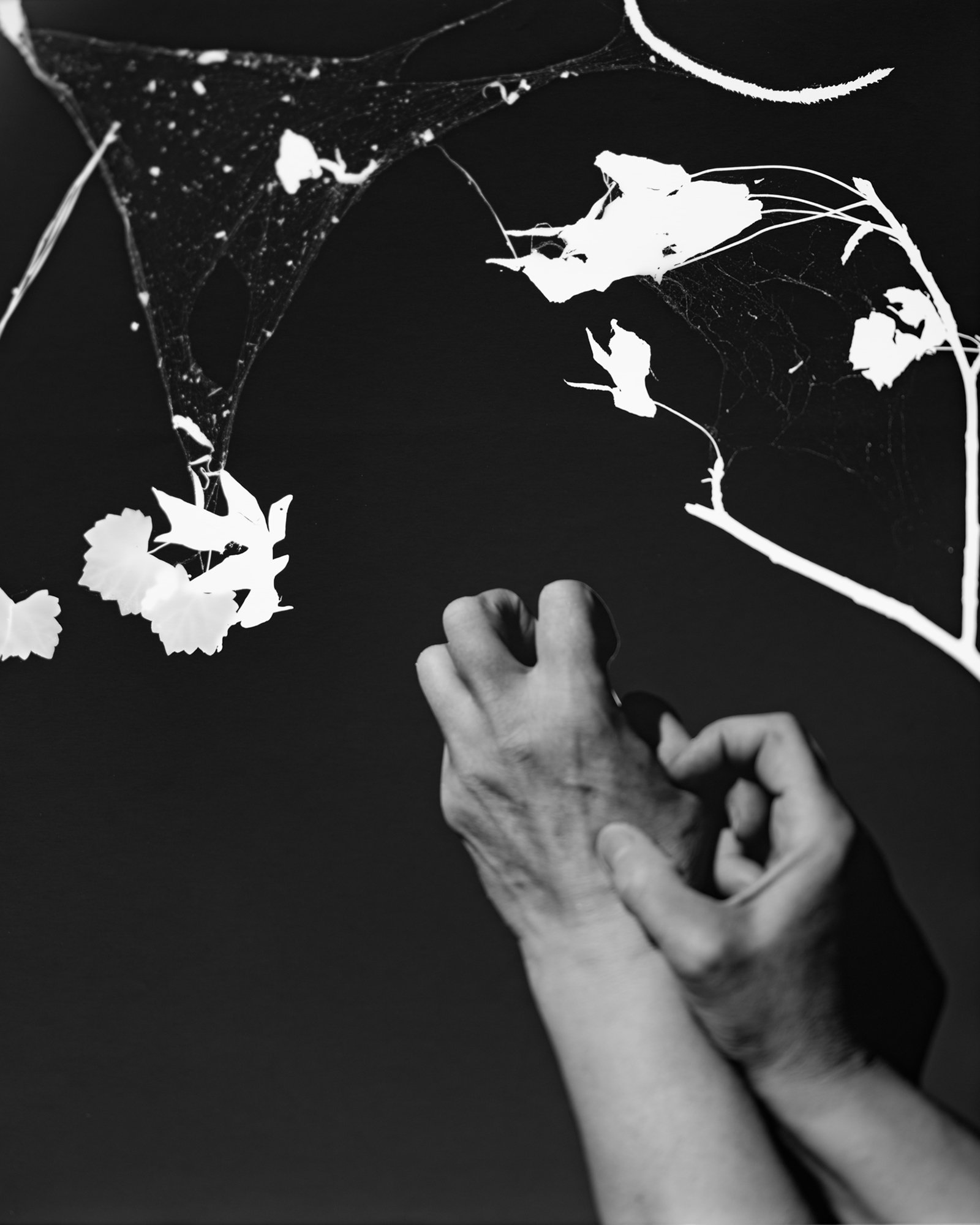 Nowruz is the name of a series of photograms inspired by the celebration of renewal and new beginnings. This printmaking project, toned with the shadows of plants, began with the desire to create a celebratory project in collaboration with friends living in two different countries. We connected through a video composed of my photographic series and a lament played alongside a sculptural performance. The lament was written by a mother who lost her son, and I added my self-portrait holding a rocket root that I gathered from the garden. This root represents death but also brings new life. I took all the plants with their roots and printed photograms that reflect the meaning of Nowruz, symbolizing the victory of light over darkness.