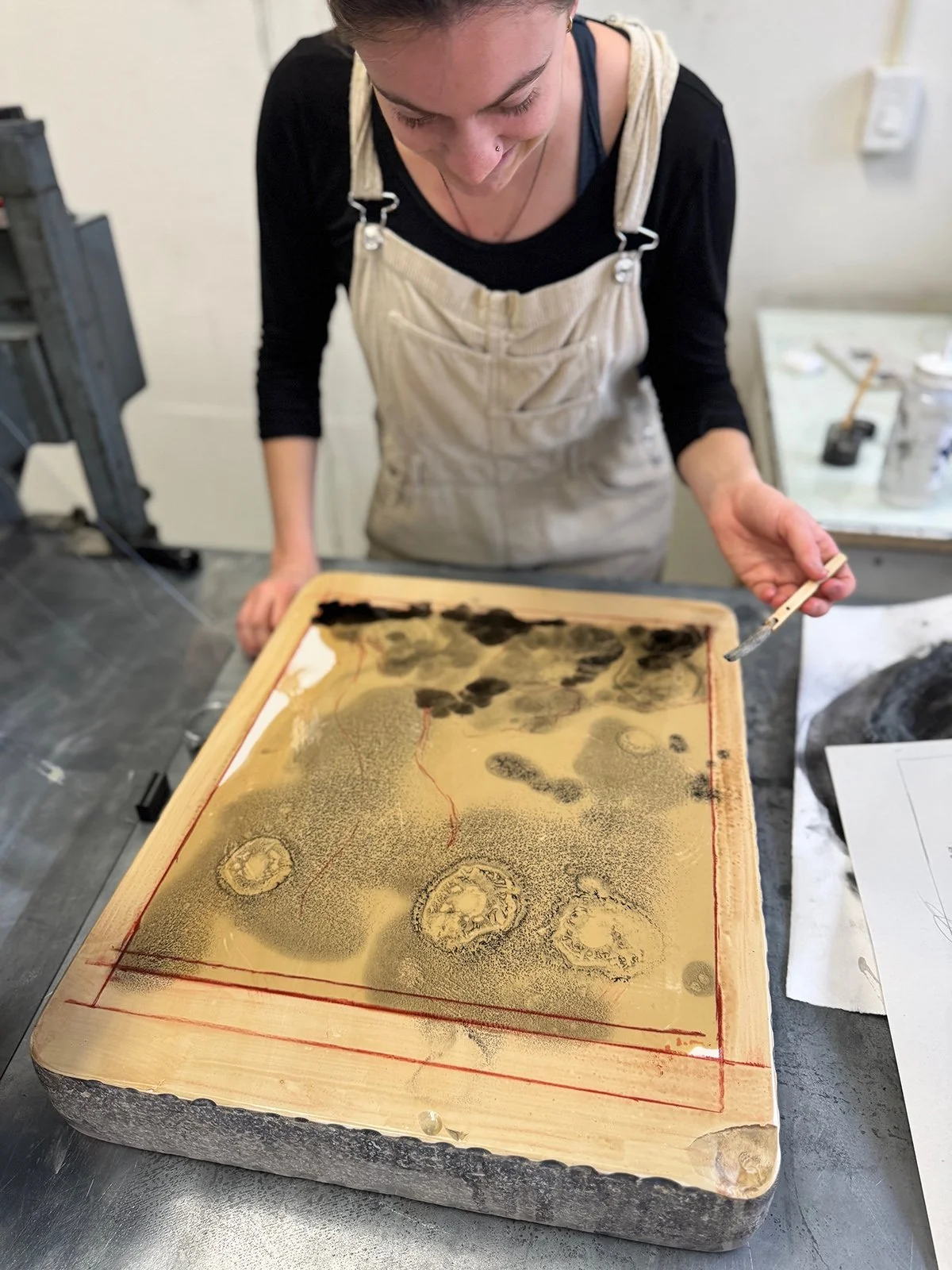 Artist Julie Lapping Rivera is a Massachusetts-based printmaker, collage artist, and educator. She began her career as a teaching artist in NYC. She is a New York Foundation for the Arts Fellowship recipient, and in 2022 was awarded a guest artist residency fellowship to Scoula Internazionale di Grafica in Venice, Italy.