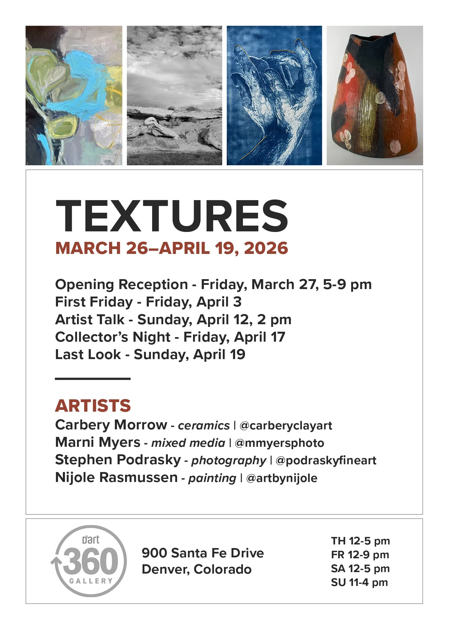 Artists Marni Myers (printmaking), Carbery Morrow (ceramics), Stephen Podrasky (photography), and Nijole Rasmussen (painting) will share insights into their creative histories, artistic voices, and evolving approaches to making new work. In dialogue with the exhibition Textures, their practices reveal how surface, process, and material presence shape meaning—where tactility, layered marks, and physical gesture become central languages of expression.
