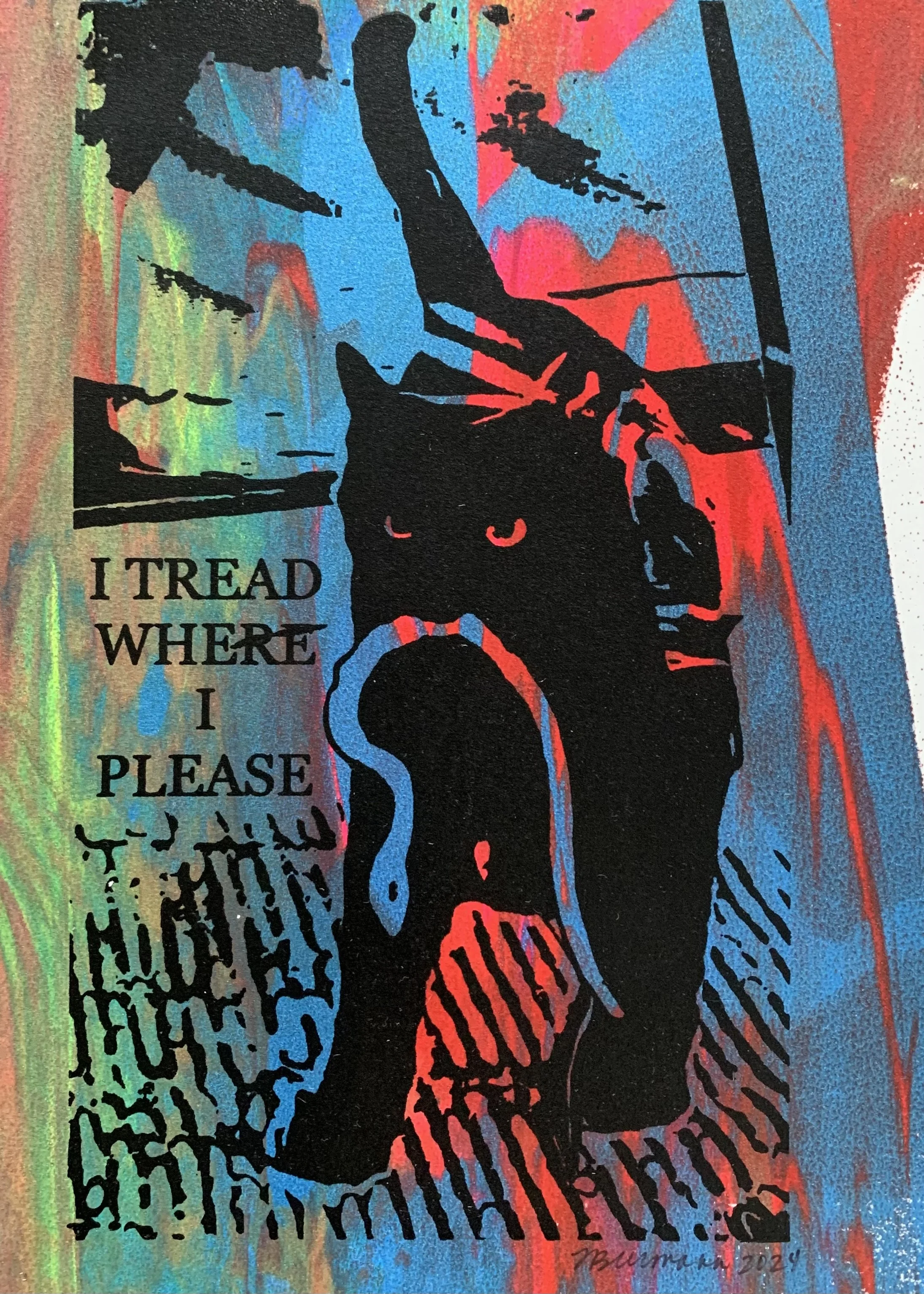 The Chameleon Art Collective presents silkscreen, gelli and block print monotypes. These individual and collaborative monotypes include impudent black cats, neon botanicals, cartographic visualizations, vinyl collections, optical feedback, Dexter Morgan, indigestion, universal human rights and so much more. The vibes are fresh, bold, punk, and lo-fi with intentional messages and purpose.